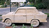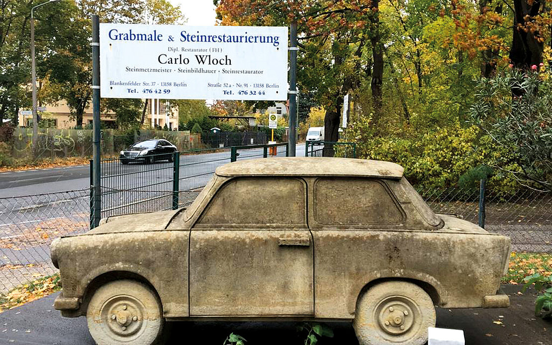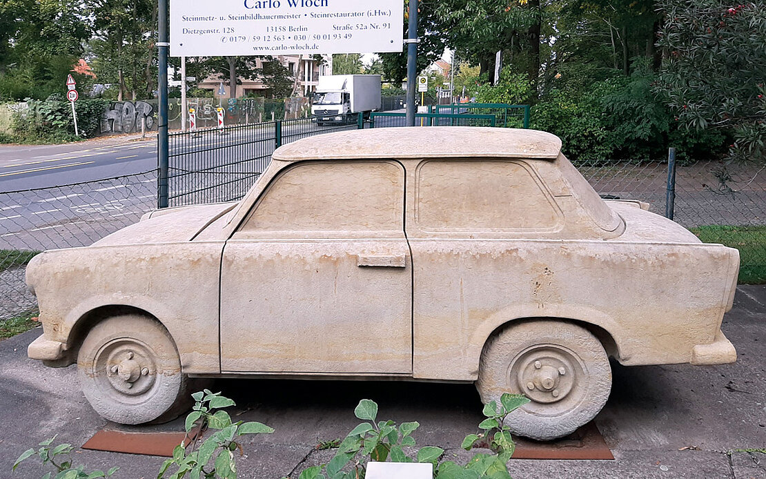 15.07.2021Wer die Dietzgenstraße 128 des Berliner Stadtteils Pankow entlang läuft, staunt nicht schlecht: denn hier steht ein 1:1 maßstabsgetreu in Stein gemeißelter Trabi 601. Das Besondere: er wurde aus einem einzigen Block gehauen.